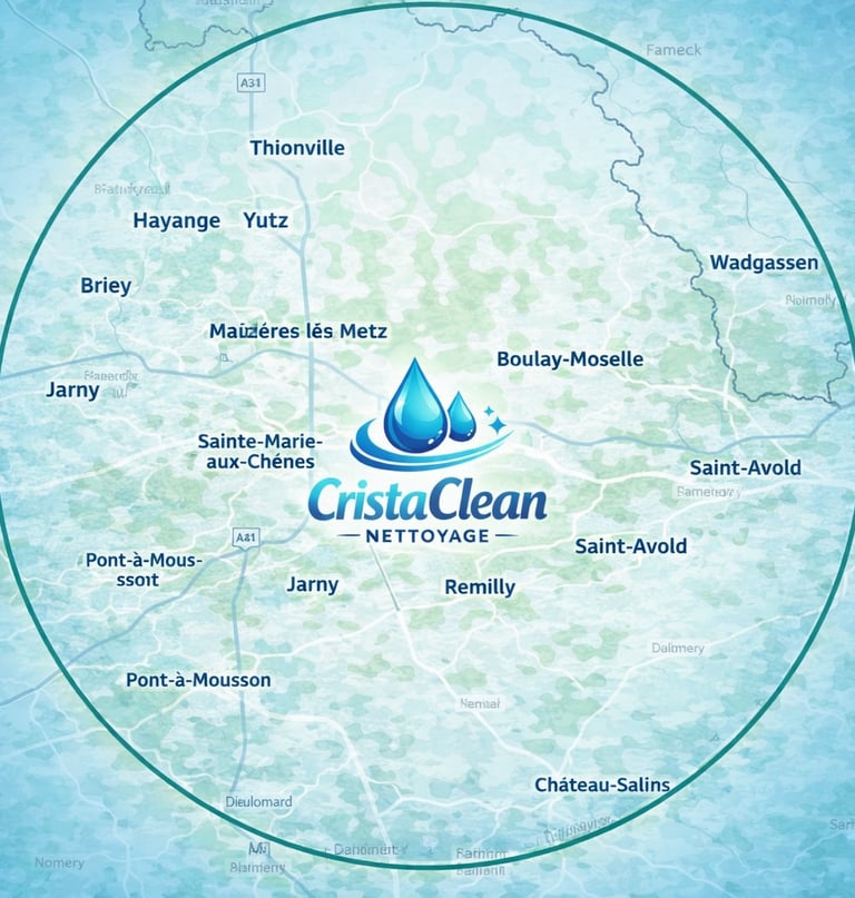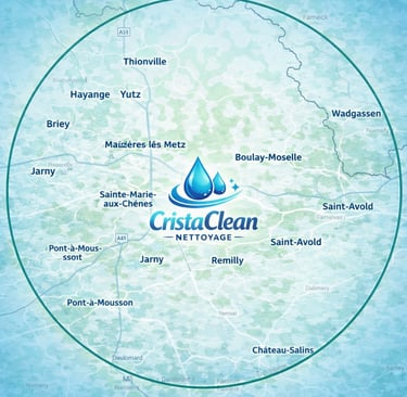 En tant qu’entreprise de nettoyage, nous intervenons en Moselle et Meurthe-et-Moselle. Globalement, nous nous déplaçons jusqu' à 40 Km autour de Metz.
